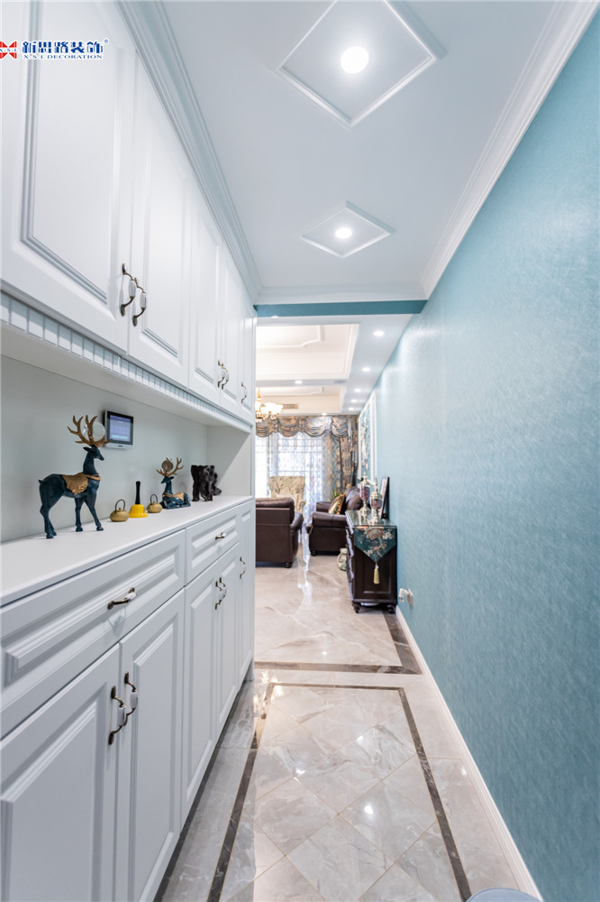 沙发背景墙使用石膏线材勾画几何图形,古典优雅;陶瓷的小鹿漫步花间,野趣横生。复古花色的窗帘与真皮质地的沙发以及实木电视柜搭配起来正合适,线条分割成菱形网格状的乳白色电视背景墙大方低调,黄铜色美式吊灯干净明亮。深墨绿色的织锦桌旗无形中又添了点奢华意味,油青色的仿古装饰摆件也是非常经典的美式元素体现。