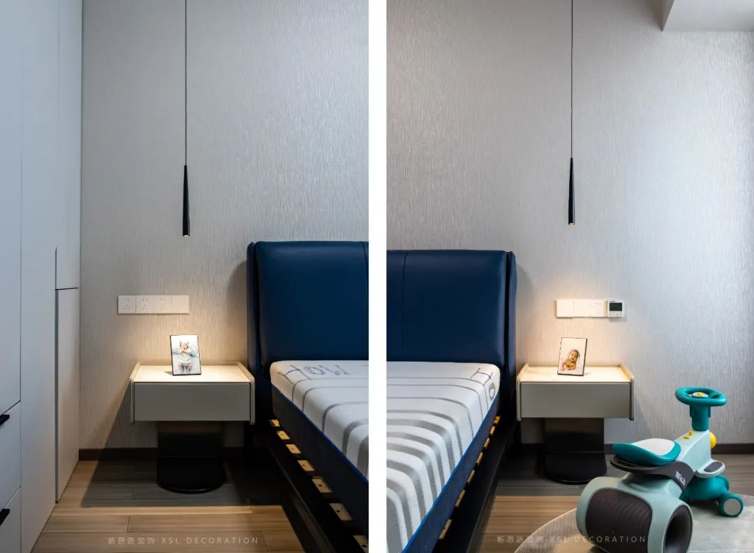 次卧作为青少年的睡眠空间,考虑到年龄的增长,所以延续简约舒适的色调。深蓝色床头点缀形成设计美感,床头柜与衣柜相结合增加层板的设计,可以满足常用书籍或装饰摆件的拿取,看似简单却使空间实现了的功能效。