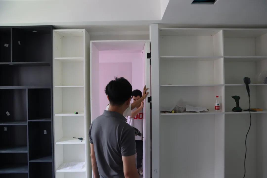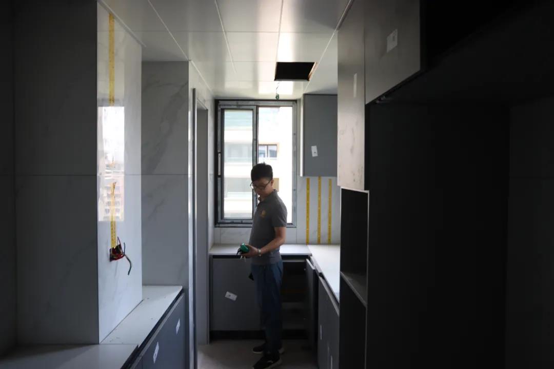 卫生间瓷砖拼贴完成后,接下来就要准备上马桶、台盆、柜子等的安装。卫生间空间有限,各个物品的尺寸需要复核多遍,保证最后在安装的时候能够正好符合。为此,设计师敖元坝和业主再次对卫生间的一些尺寸进行了测量。